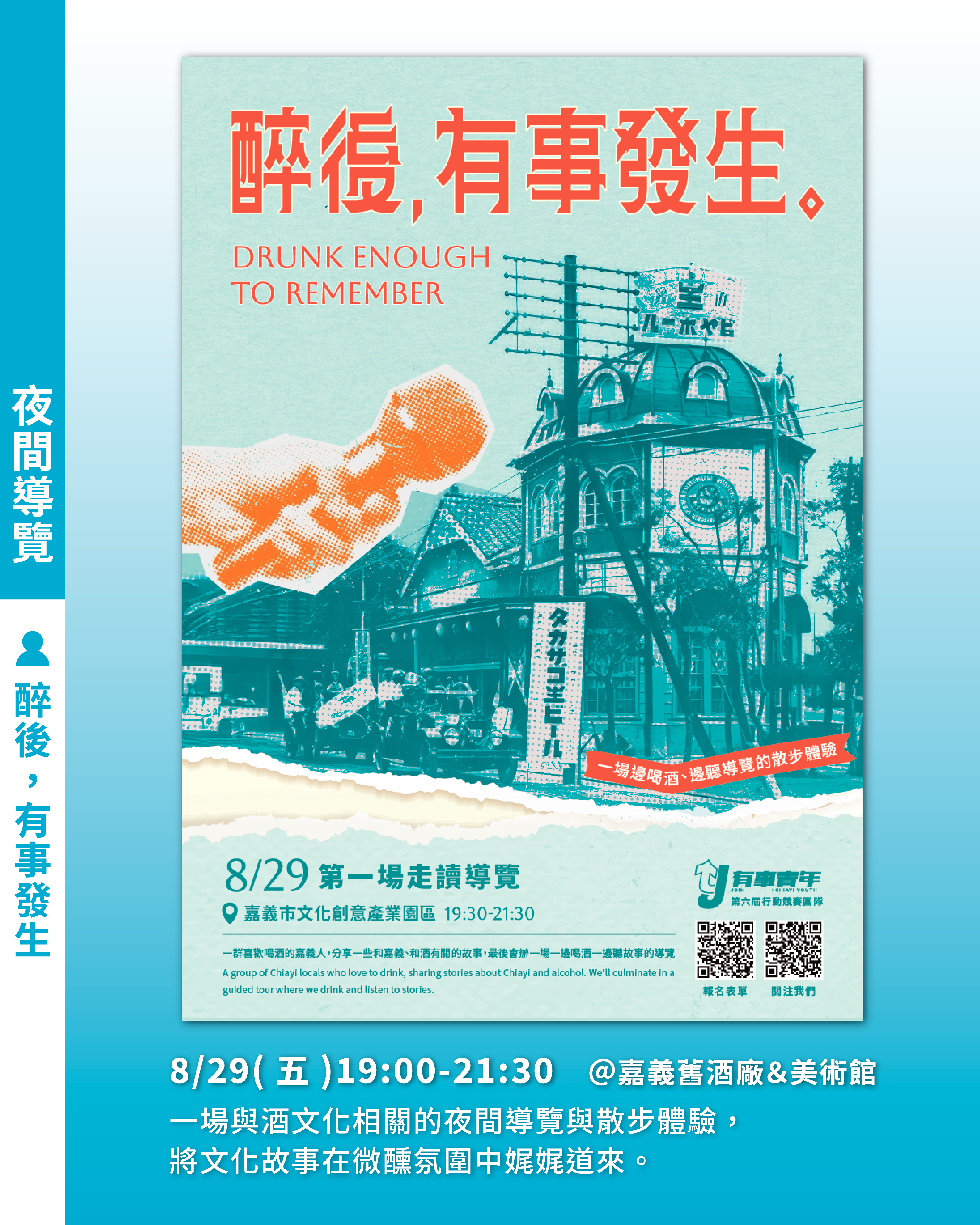 活動內容:一場與酒文化相關的夜間導覽與散步體驗,將文化故事在微醺氛圍中娓娓道來。@drink_chiayi2025